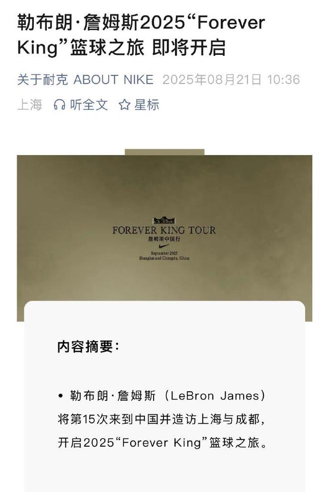 终于来了!詹姆斯中国行官宣,9月先后造访上海与成都